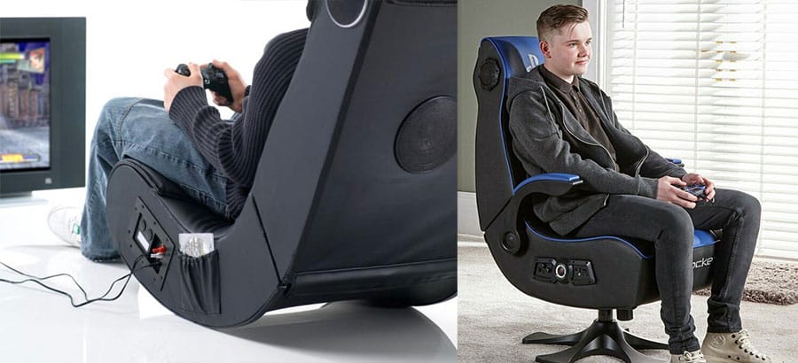 Console gaming floor rockers look like a recliner without legs. Cheap models come with pockets on the sides to hold game controllers and snacks. Advanced models offer better upholstery and extra features. The most popular extras for floor rockers are music systems and massage units.
