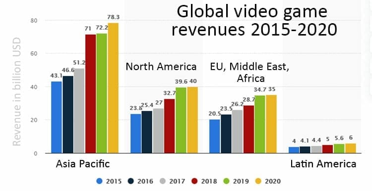 Most of that revenue comes from the Asia-Pacific. In 2019, games revenue from in the Asia Pacific region amounted USD $72.2 billion. That was more than double the North American market’s gaming revenue. Leading markets in the Asia Pacific region include China, South Korea, and Japan.