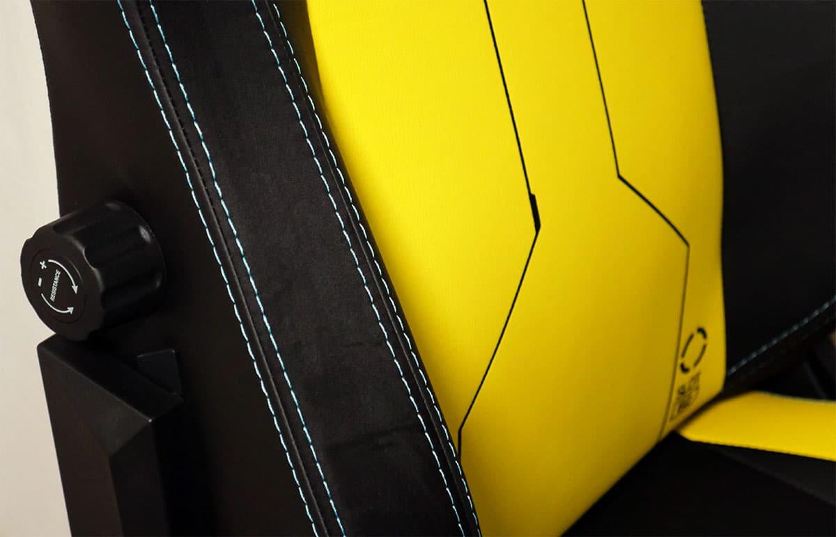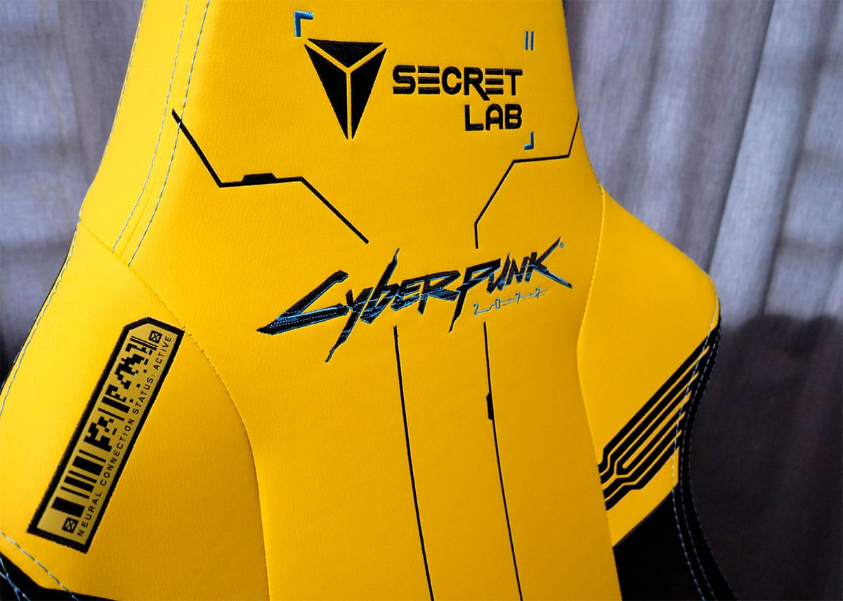 The Titan Cyberpunk 2077 gaming chair comes in a brilliant, eye-popping yellow design. The matte yellow upholstery is smooth, soft, and very bright. On the backrest, the red embroidered Samurai logo pops with intensity.